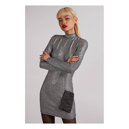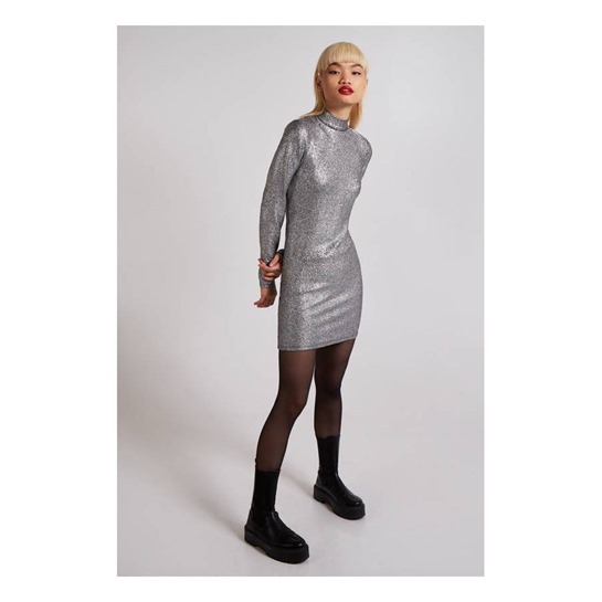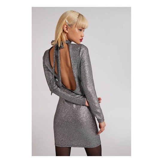 Eye-Catching Mini Length Silver Party DressDazzle all night in this eye-catching mini party dress with a radiant metallic shine. The glamorous open-back detail turns heads, while the stylish high-neck design adds chic sophistication. Crafted from super-stretch fabric and fully lined for comfort, it hugs your curves beautifully—perfect for unforgettable nights out.Eye-catching Mini length Party dress, metallic shine