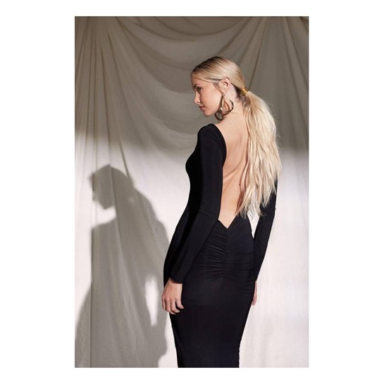 The form-fitting slinky fabric gracefully contours all your womanly curves, while the daring open back with ruched detailing adds a captivating element of intrigue. Perfect for those nights when you want to turn heads